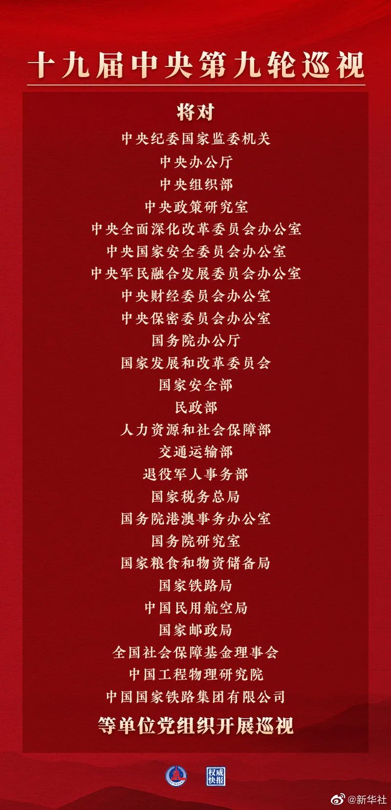 经党中央批准,十九届中央第九轮巡视将对中央纪委国家监委机关、中央办公厅、中央组织部、中央政策研究室、中央全面深化改革委员会办公室、中央国家安全委员会办公室、中央军民融合发展委员会办公室、中央财经委员会办公室、中央保密委员会办公室;国务院办公厅、国家发展和改革委员会、国家安全部、民政部、人力资源和社会保障部、交通运输部、退役军人事务部、国家税务总局、国务院港澳事务办公室、国务院研究室、国家粮食和物资储备局、国家铁路局、中国民用航空局、国家邮政局;全国社会保障基金理事会、中国工程物理研究院、中国国家铁路集团有限公司等单位党组织开展巡视。
